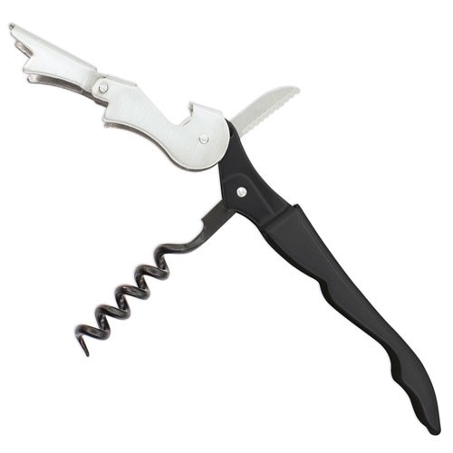 Nueva generación de sacacorchos con doble palanca, para una suave y fácil extracción del tapón. Incluye un práctico abrebotellas con mango ergonómico en color.