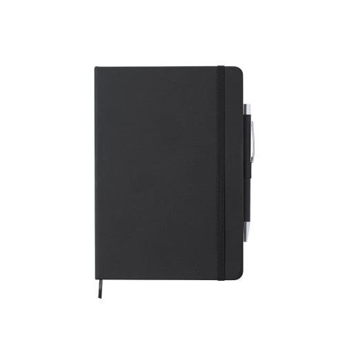 Set de bloc y bolígrafo a juego. Bloc de tapas rígidas con suave tacto acabado en polipiel, incluye soporte para bolígrafo, marcapáginas y cierre elástico, con interior de 100 hojas a una raya. Además, bolígrafo de aluminio en acabado goma con carga jumbo. Disponible en una variada gama de colores.