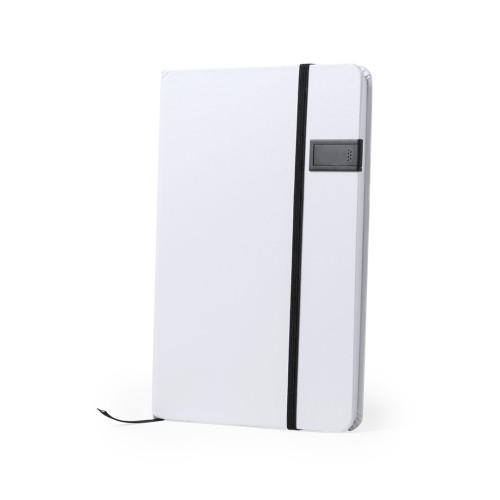 Bloc de notas de elegante acabado en color blanco, con memoria USB de 16GB de capacidad integrada en la tapa frontal. Cinta elástica, memoria USB y marcapáginas a juego, en variada gama de colores. Incluye 100 hojas con disposición a una raya.