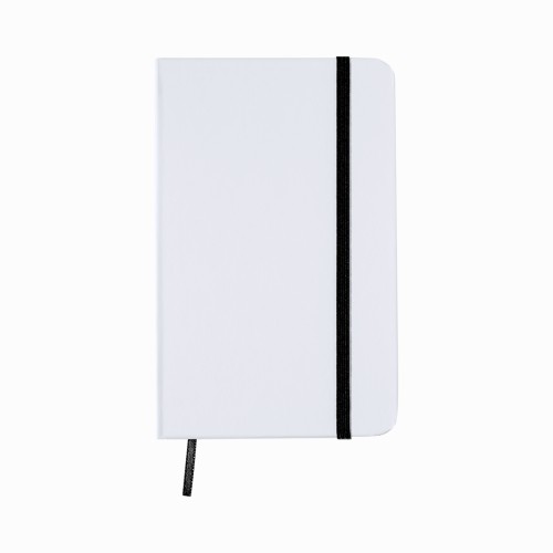 Bloc de notas con tapas de suave tacto acabadas en resistente cartón de elegante acabado en blanco. Especialmente diseñado para marcaje digital en tapas, cuenta con 80 hojas lisas además de elástico de sujeción y marcapáginas de tela a juego.