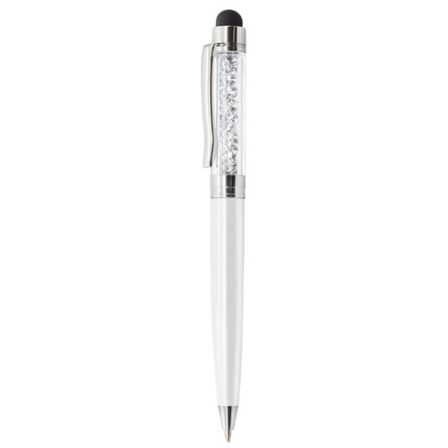 Original y elegante bolígrafo con sistema giratorio, decorado con cristales strass en su interior.Incluye touch para utilizarlo con su móvil o tabletEscritura azulCada pieza en bolsa individual.