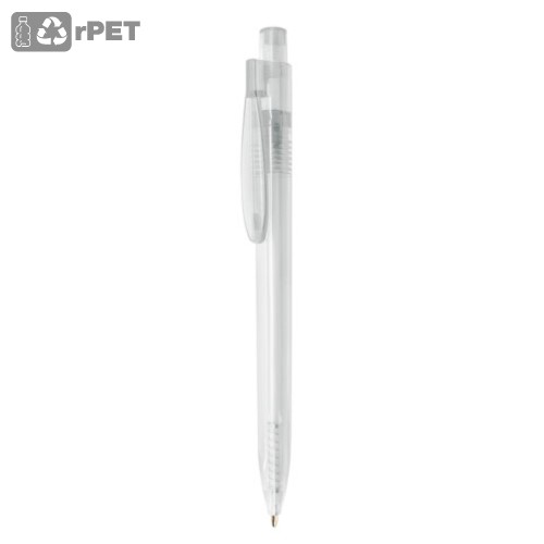Esta colección de bolígrafos está realizada con material rPET, a partir de plástico reciclado básicamente de las típicas botellas de agua que se encuentran en cualquier supermercado. Incluye un clip con gran zona de marcaje. Escritura Azul.Disponible en colores azul, rojo, naranja, negro, transparente y verde.