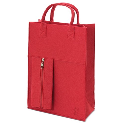 Bolsa fabricada en fieltro RPET, con asas cortas.Incluye un bolsillo delantero medida 10x19 cmDisponible en colores marino, pistacho, rojo y gris.