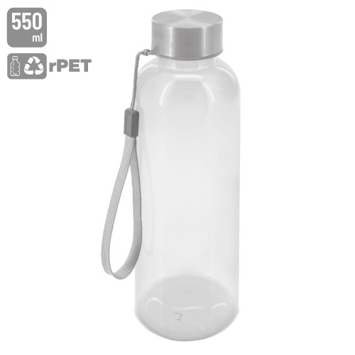 Botella con una capacidad de 550 ml, fabricada con material rPet a partir de materiales reciclados siguiendo una estrategia sostenible.Disponible en azul, naranja, royal y transparente. El rPet da nueva vida a los residuos sólidos y así reduce su consumo, contribuyendo al cuidado del medio ambiente.Presentado en caja individual decoradaIncluye caja de presentación.