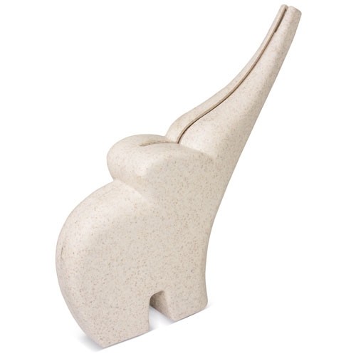 Hucha realizada en fibra de trigo, presentada en bolsa individual y caja de presentación.