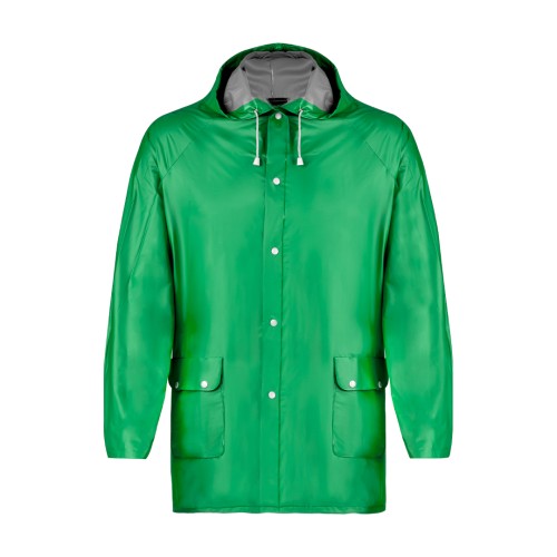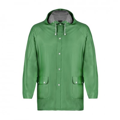 Impermeable en resistente PVC de acabado termosellado en variada gama de colores. Con capucha y cordones de ajuste, cierres de corchete y bolsillos. Disponible en tallas M-L, XL-XXL.