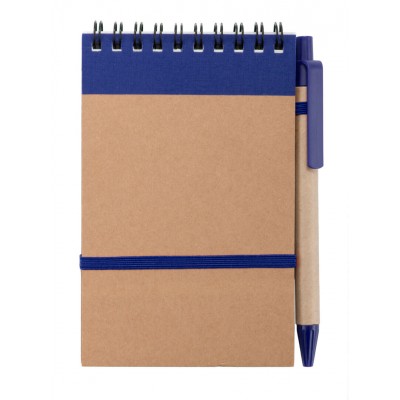 Libreta de anillas hecha de resistente cartón reciclado bicolor con suaves tapas, elástico de sujeción en portada y bolígrafo en cartón reciclado a juego. En atrevidos colores.