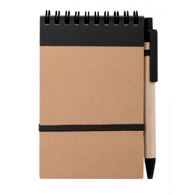 Libreta de anillas hecha de resistente cartón reciclado bicolor con suaves tapas, elástico de sujeción en portada y bolígrafo en cartón reciclado a juego. En atrevidos colores.