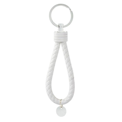Elegante llavero realizado en polipiel trenzada, con detalle de chapita metálica redondeada.