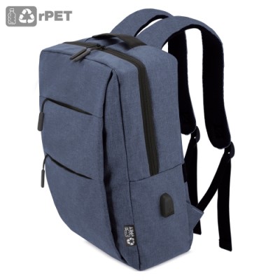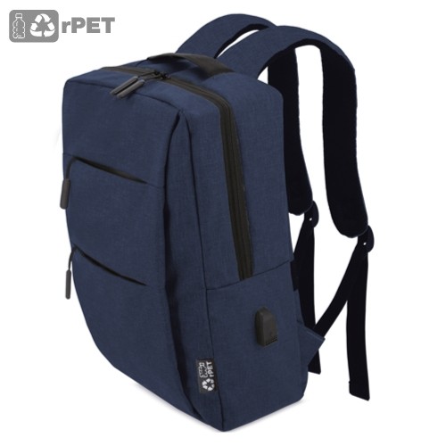 Mochila realizada en material rpetEn su interior podemos encontrar una serie de departamentos, aptos para portatiles hasta 17, interior y tirantes acolchados.Incluye toma de usb para cargaAdemás incluye sujección elástica para llevar en un trolleyDisponible en color negro, gris y marinoCada pieza presentada en bolsa individual con autocierre
