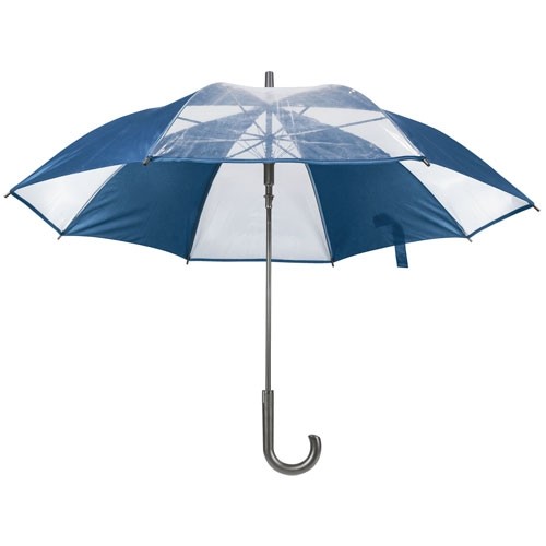 Paraguas de 8 paneles transparentes combinados con colores opacos, estructura y varillas metálicas.Apertura automática con pulsador integrado en un elegante mango negro.