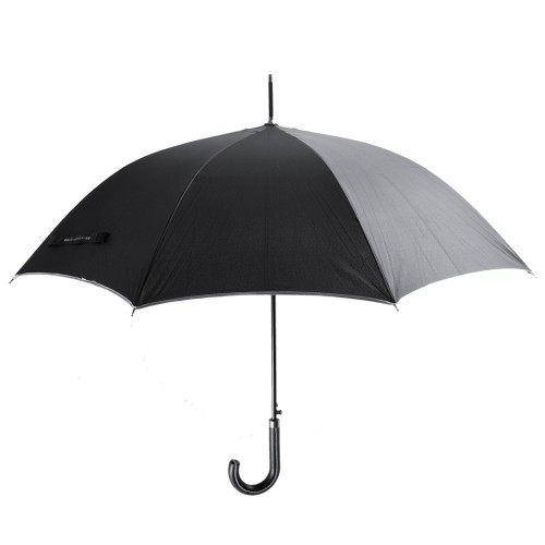 Paraguas de Antonio Miró de 8 paneles, con elegante diseño en color negro. De 120cm de diámetro, con apertura automática, sistema antiviento y en resistente material pongee. Con varillas metálicas en color negro, cierre de velcro y mango de suave tacto. Presentado en funda con logotipo de la marca y cinta con accesorio de ajuste.