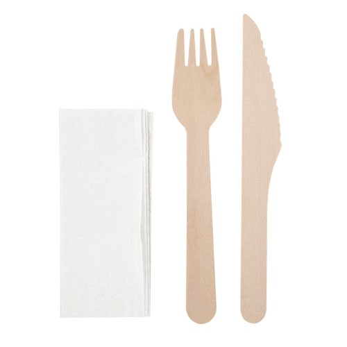 Set de Cubiertos ecológicos, fabricados con madera procedente de fuentes sostenibles. FSC A000511 Incluye tenedor, cuchillo y servilleta (se vende en múltiplos de 100 unidades)