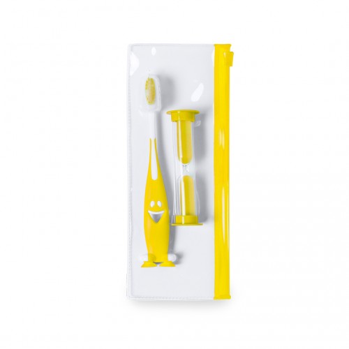 Set Cepillo de dientes y reloj de arena en llamativos colores. Incluye cepillo de divertido diseño y suave tacto con ventosas en la base y reloj de arena de 2 minutos de duración. Presentado en bolsa individual con cierre zip.
