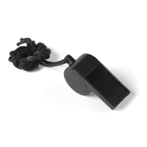 Divertido silbato de clásico diseño en amplia gama de vivos colores con cinta para el cuello a juego.
