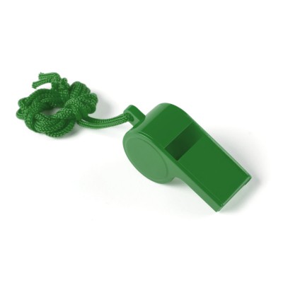 Divertido silbato de clásico diseño en amplia gama de vivos colores con cinta para el cuello a juego.