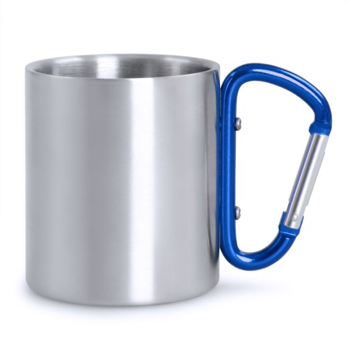 Taza de acero inox de 210ml, con cuerpo de acabado brillante metálico y una funcional asa en forma de mosquetón de colores variados pudiendo ser fácil de transportar. Presentada en una caja de cartón Kraft.