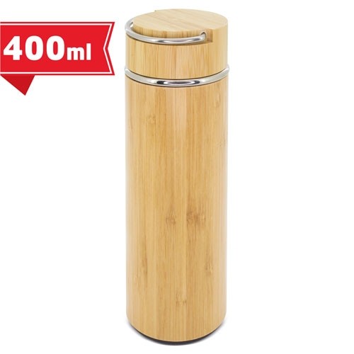 Realizado en bambú con doble cámara para mejor conservación, asa para transporte plegable e infusar.Capacidad 400 ml
