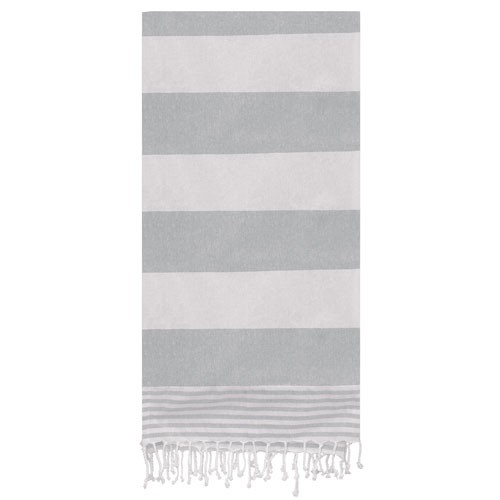 Descubra nuestra nueva colección de toallas pareo, con una gran variedad de colores que le permitirán adaptarse a su imagen corporativa. Imagine el logo de su empresa extendido en la arena de una playa paradisíaca, o en una piscina de lujo.La toalla pareo con rizo “Cala Bonita” (T-269) está realizada 100% en algodón en su exterior con un diseño a rayas disponible en gris y en rojo-azul. Su interior presenta una toalla de rizo, 100% poliéster. El acabado de flecos trenzados en los extremos le aporta un toque original y actual.